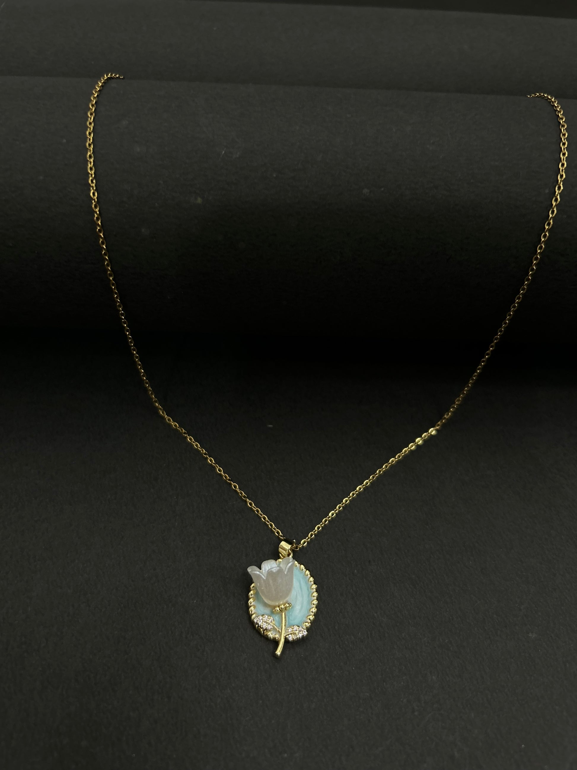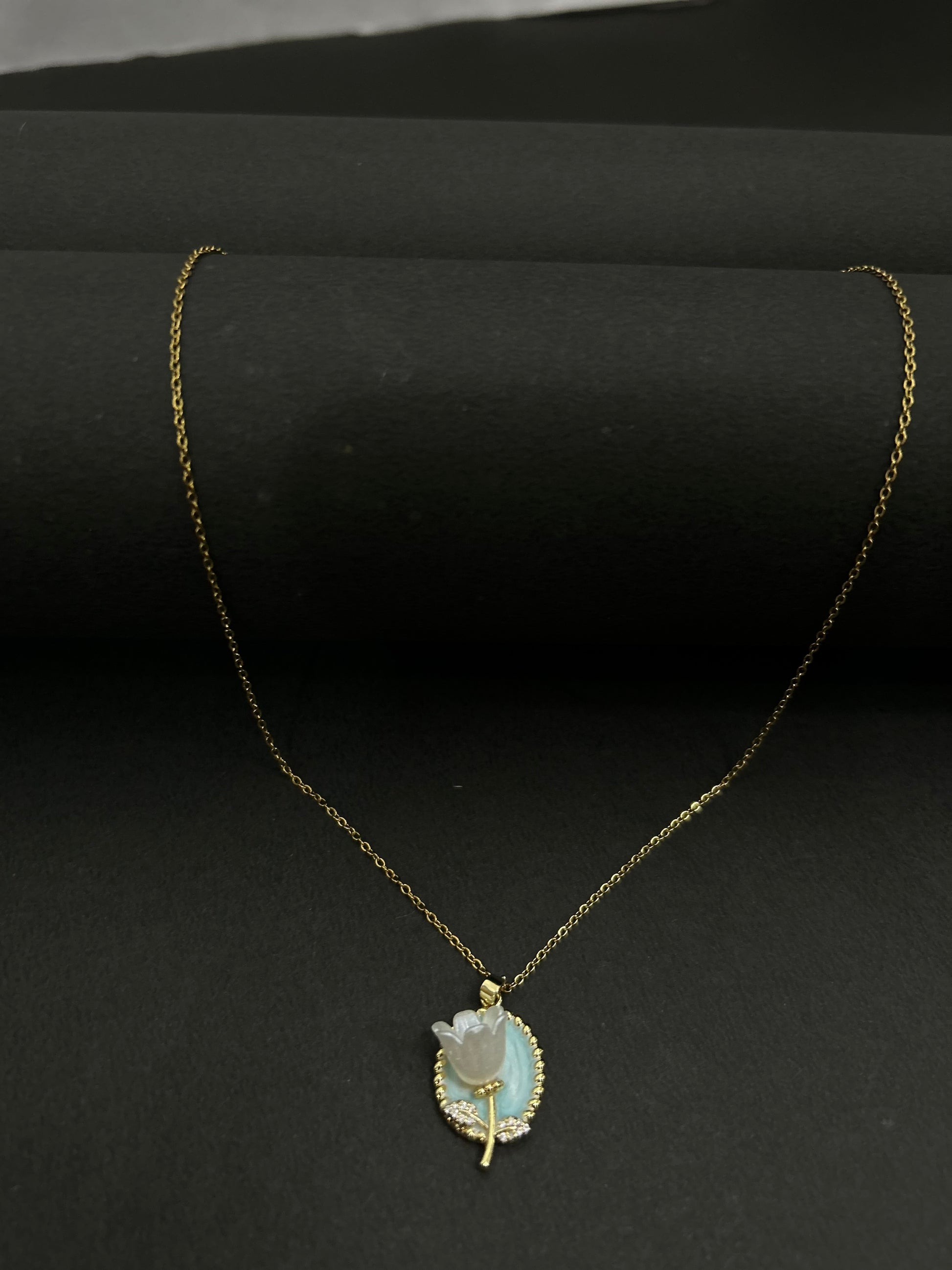 A graceful gold pendant necklace featuring a soft blue flower design. Crafted from stainless steel, this piece embodies elegance and calm femininity.