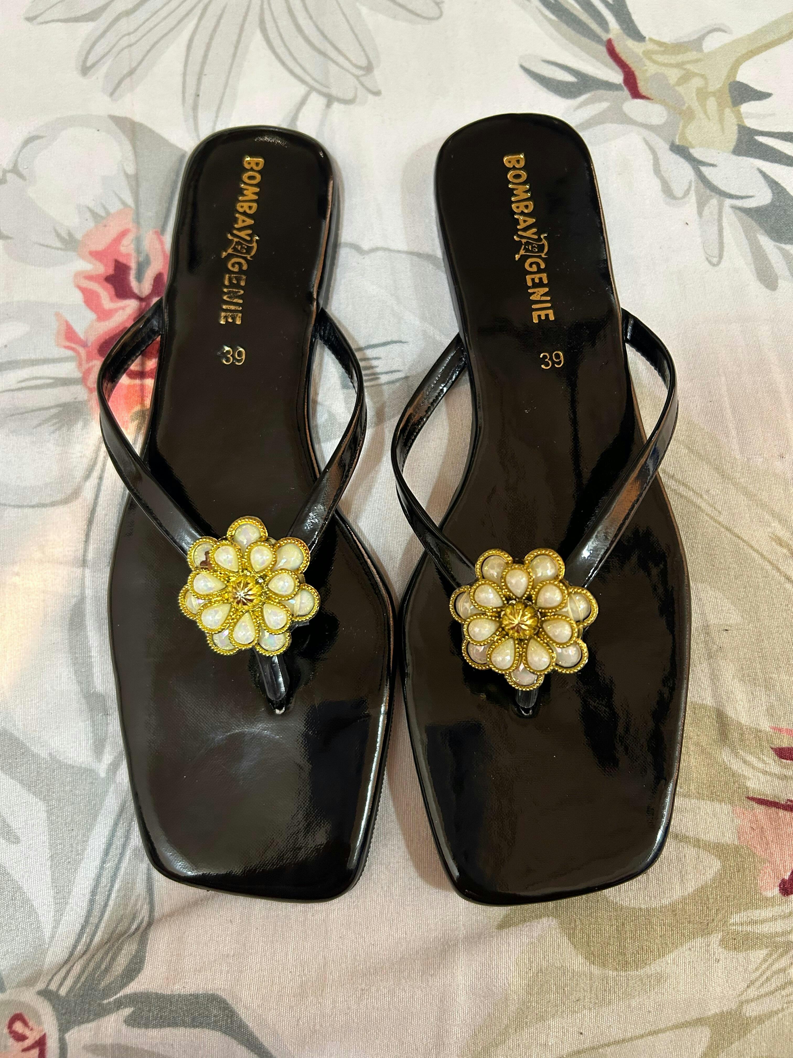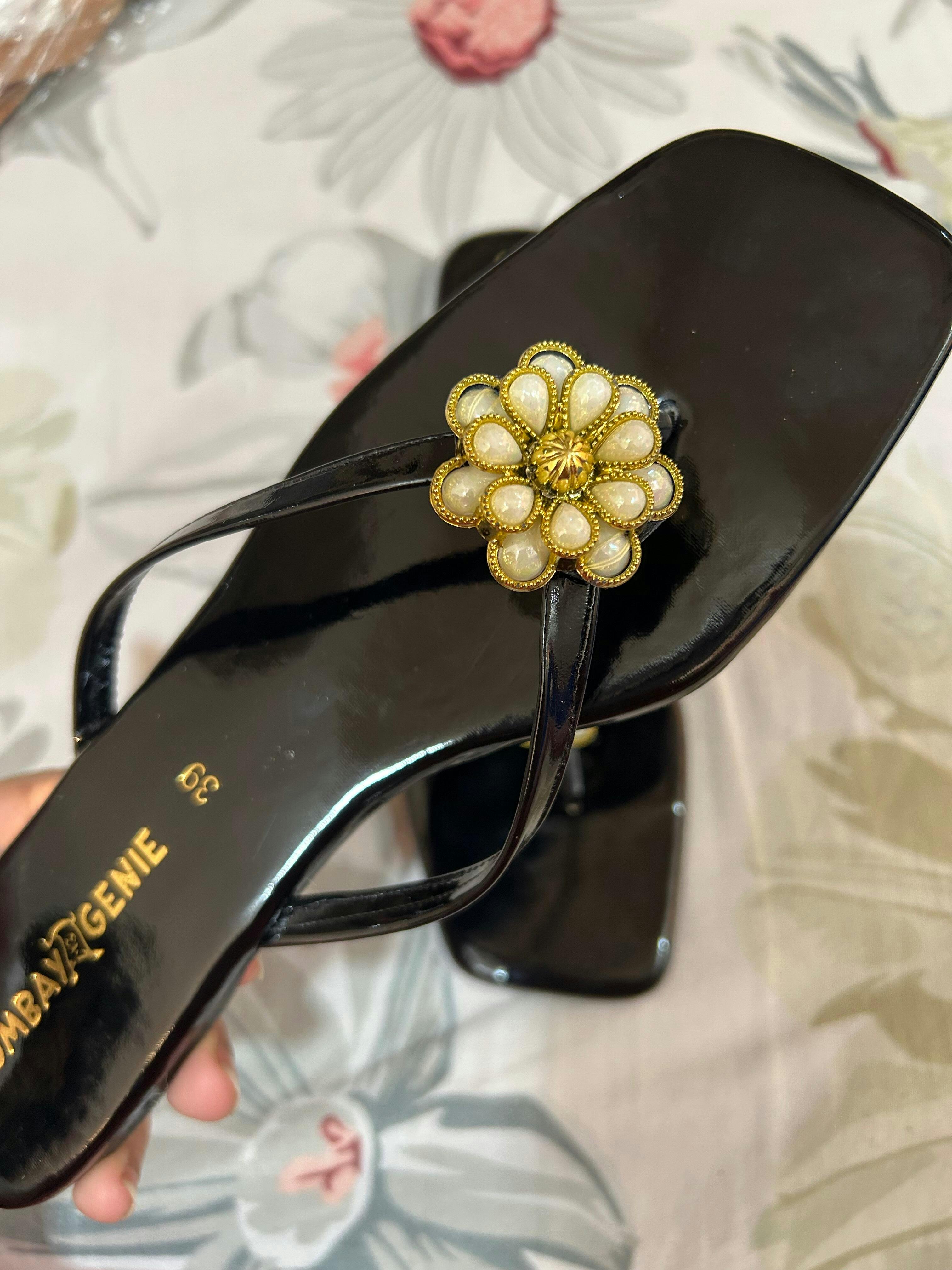 Add a touch of floral elegance to your everyday look with these Black Floral Embellished Flats. Designed with a 6mm padded cushion, soft faux leather, and durable TPR sole for all-day comfort. Perfect for brunches, outings, or casual wear.