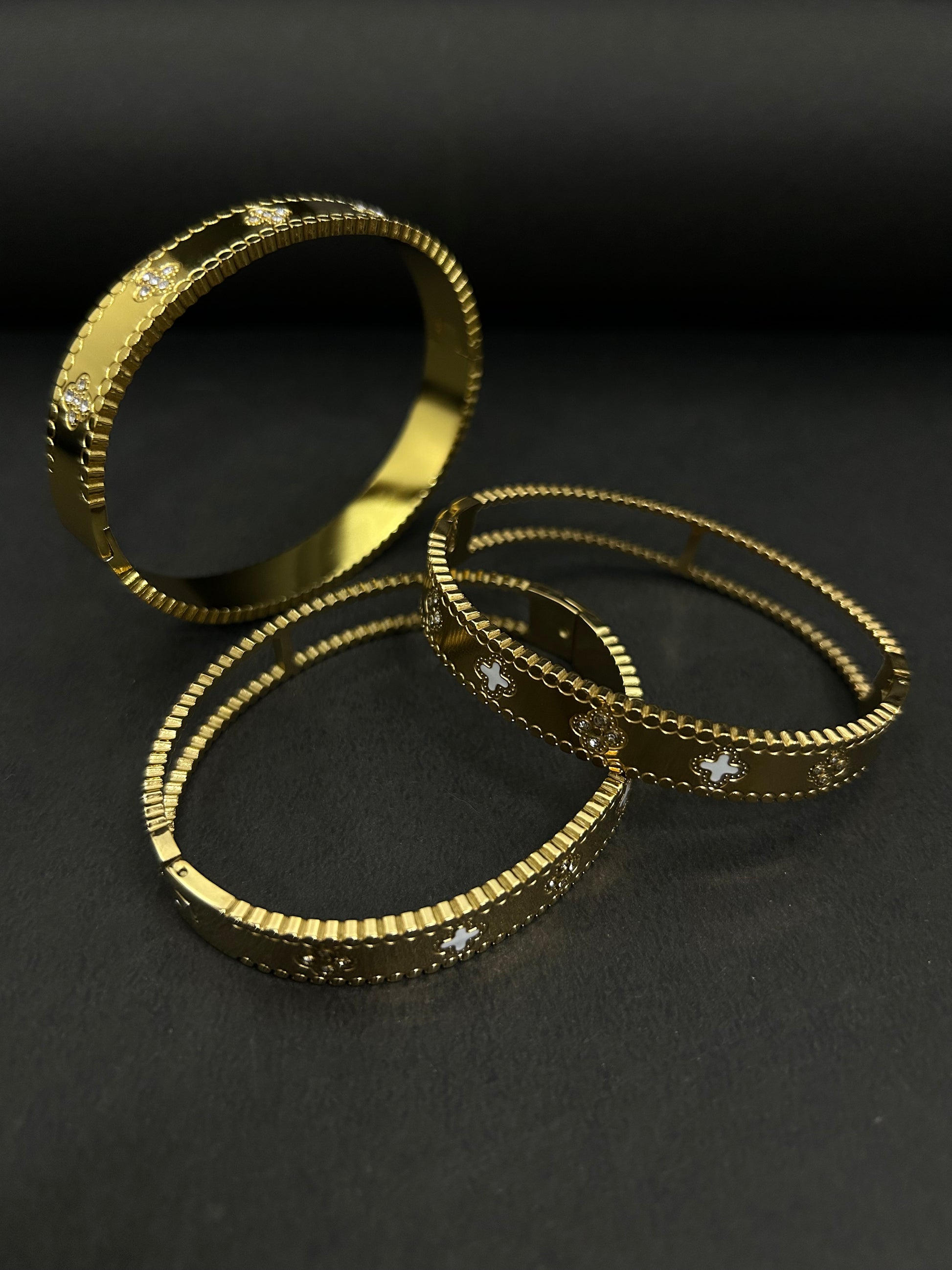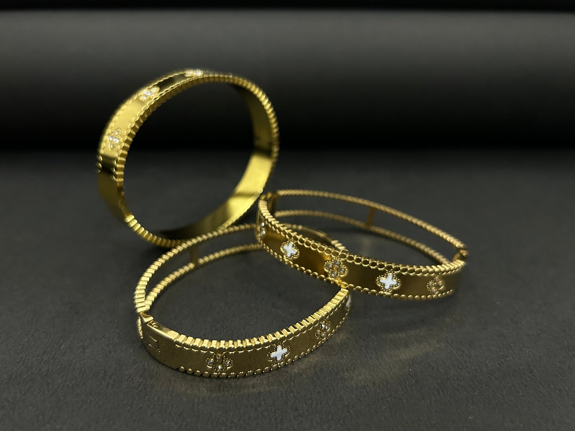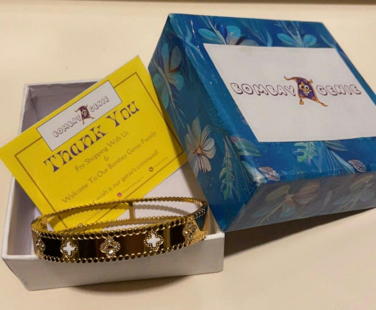 Grace meets glamour with this clover-patterned gold bracelet. Its intricate enamel detailing makes it the perfect piece for fashion-forward women.
