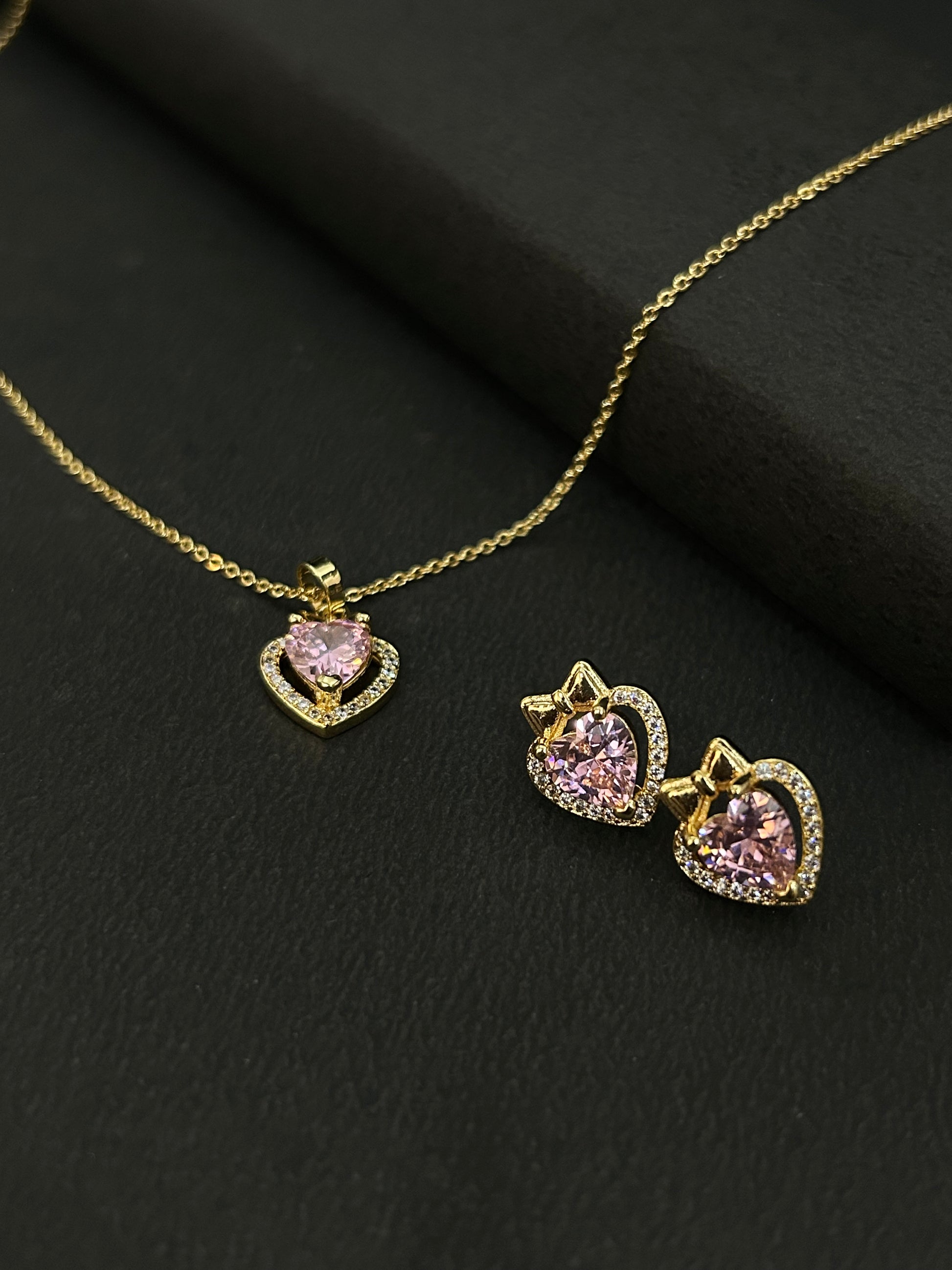 A charming gold necklace set featuring pink heart-shaped stones for a touch of romance. Made from high-quality stainless steel for durability and shine.