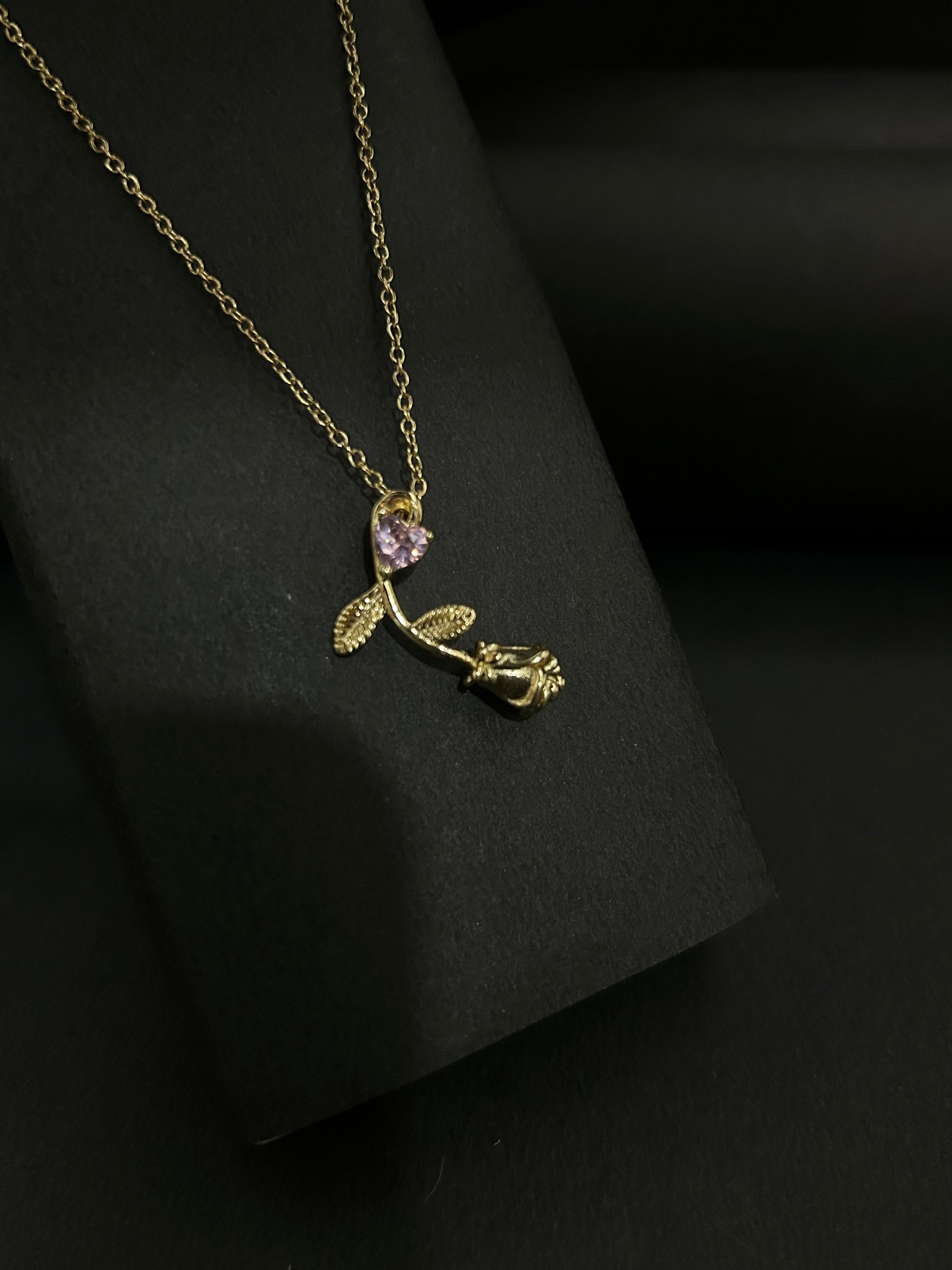This stunning rose blossom necklace features a pink gemstone accent that symbolizes love and femininity. Designed for the contemporary woman who values timeless elegance.