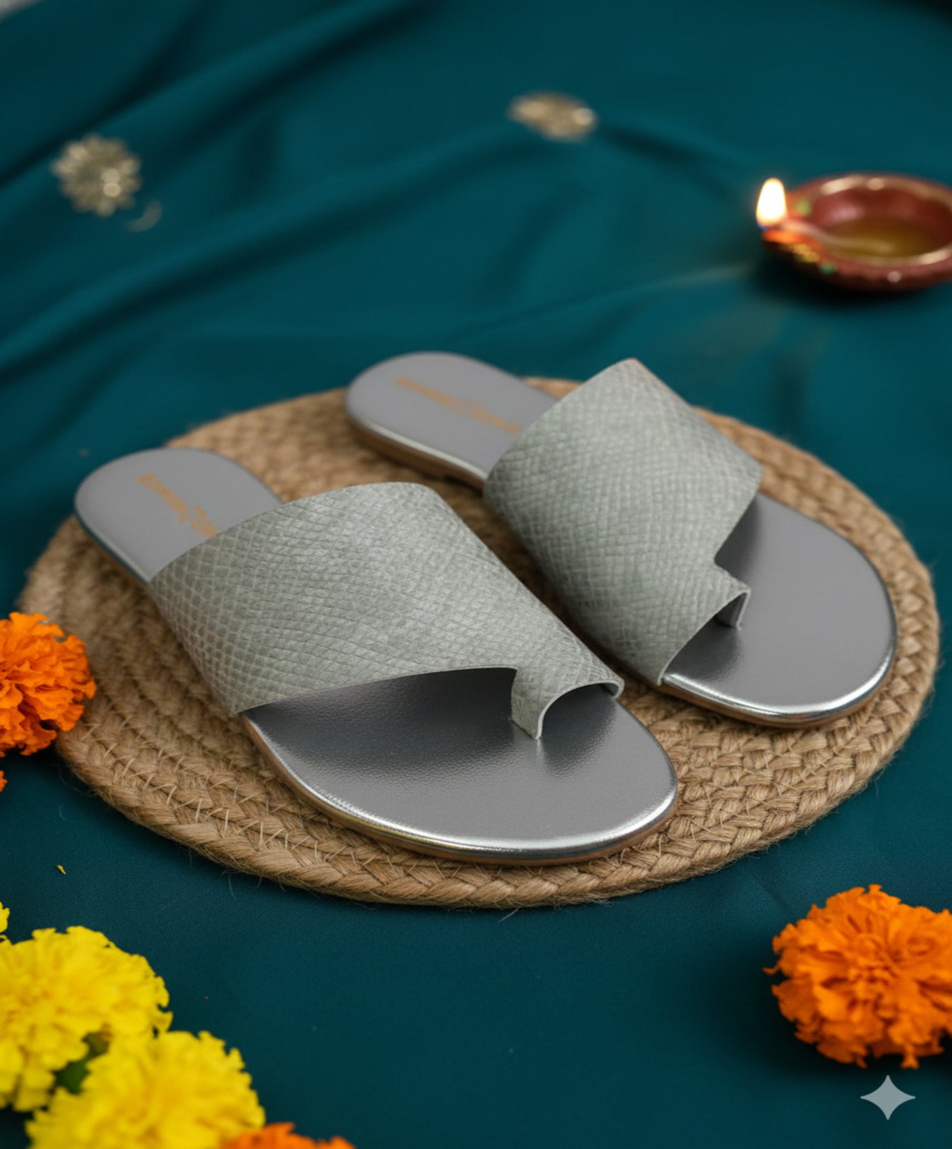 Shimmer in style with these chic silver slip-on sandals, featuring a textured strap and glossy base. Built with faux leather, cushioned comfort, and a sturdy TPR sole, these flats are ideal for festive looks, ethnic wear, and special occasions.